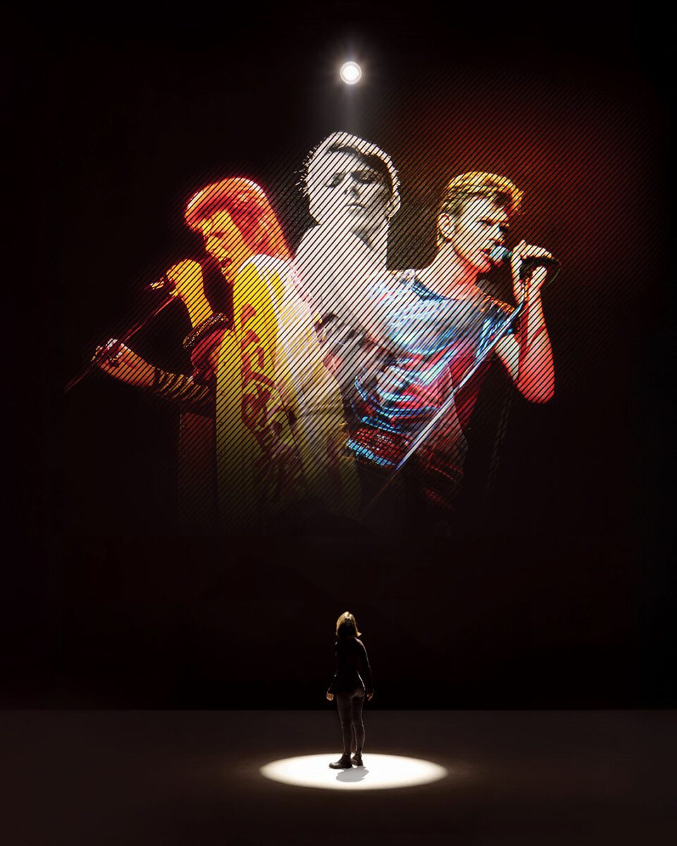 TW: A traditional exhibition foregrounds venerated physical objects – evidence of a moment that has passed, and is now represented by a token. There can be something wonderful about that which draws on the same emotions that inspires pilgrimage, but in this environment we wanted to create something that felt alive and present, not trapped in a glass box. We’ve got this incredible footage, a huge space and a powerful sound system, but most importantly we’ve got a room filled with people who are experiencing something together. It isn’t maudlin, it should feel exhilarating and inspiring, and full of life.