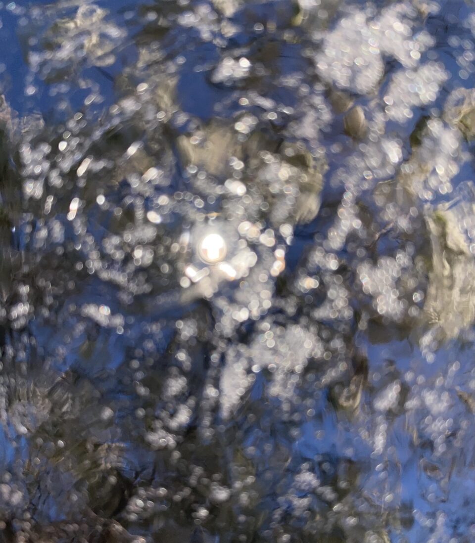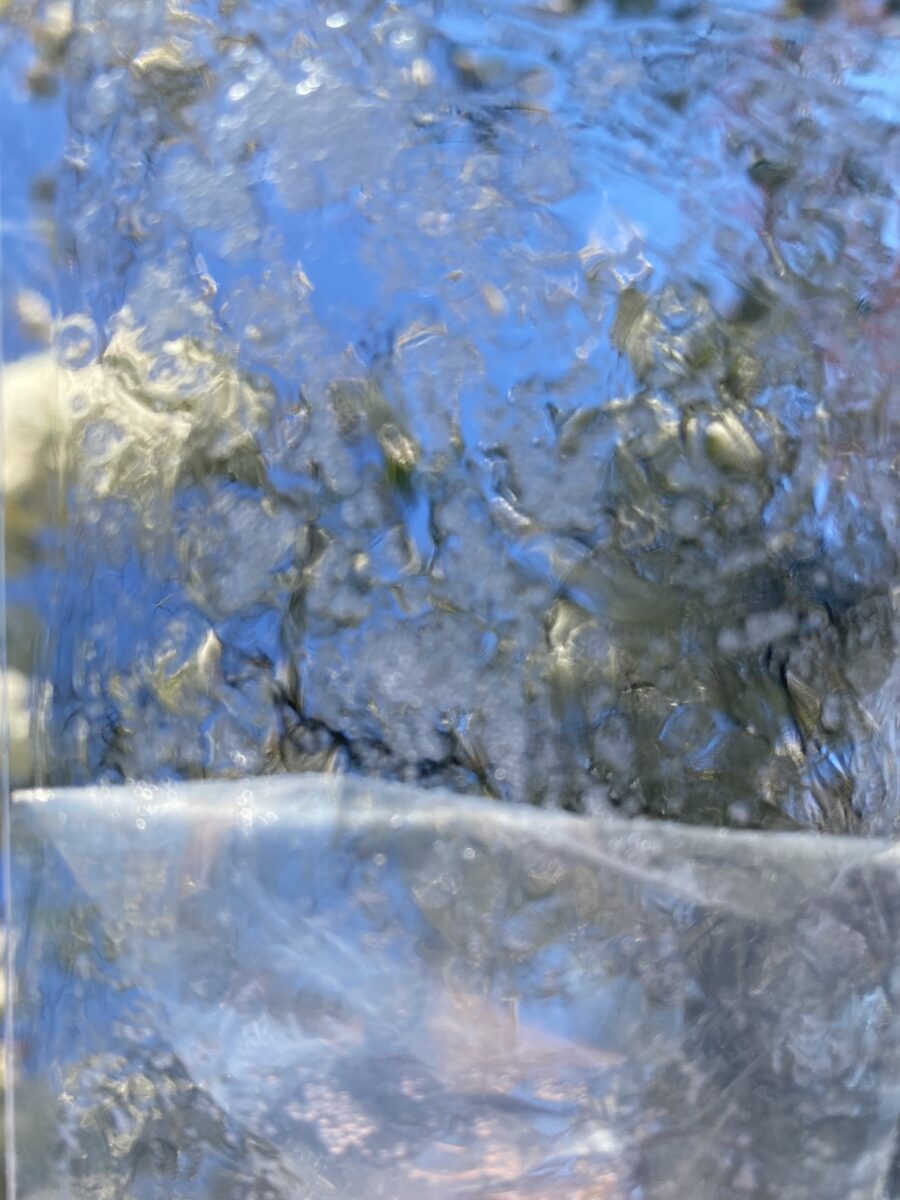 A similar sensibility runs through Persephone (2021), one of Sun’s works on canvas. Painting is central to Sun’s oeuvre, and this abstract piece reflects on the first turn of spring after the pandemic – “tentative, luminous, and slightly unreal.” Here, Sun reinterprets the Chinese heritage technique of piaoqi (floating lacquer) through water and acrylic. The surface – textured, multilayered, gently Pollock-esque – is built up through splattering, pouring and drips, “allowing pigment to bloom, float, and settle in unpredictable tides.” Visually, it gives a strikingly similar effect to that of the filter in Held in Blur. On a conceptual level, the pigment behaves like memory – dispersing and reforming beyond the artist’s control.