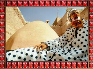 Hassan Hajjaj blends North African culture with western iconographies. Framed images subvert and democratise fashion logos and brands.
