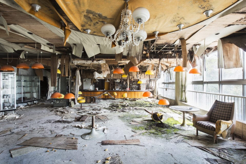 10. Reginald Van de Velde, Seventies Extravaganza. The view inside the lobby of a former Japanese hotel. Named the Kuroshio Inn this hotel is located on the island of Awaji. Neatly built atop a hill it allowed guests to enjoy the most spectacular vistas on the Pacific coastline. Its remote location contributed to a decline in visitors, and it went out of business in the early 1980s. Courtesy of the artist.