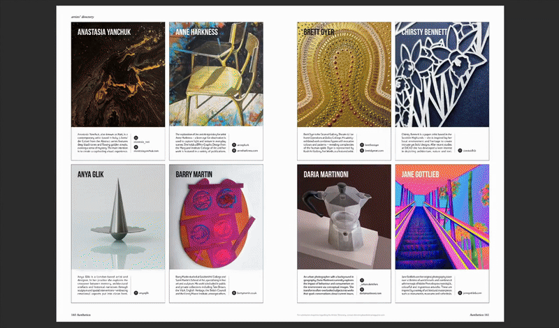 In each edition of the magazine, we publish the Aesthetica Artists’ Directory. This is a curated listings service where artists can pay to promote their practice with an image of their work, a text bio about their practice, and relevant links and handles for their online pages.