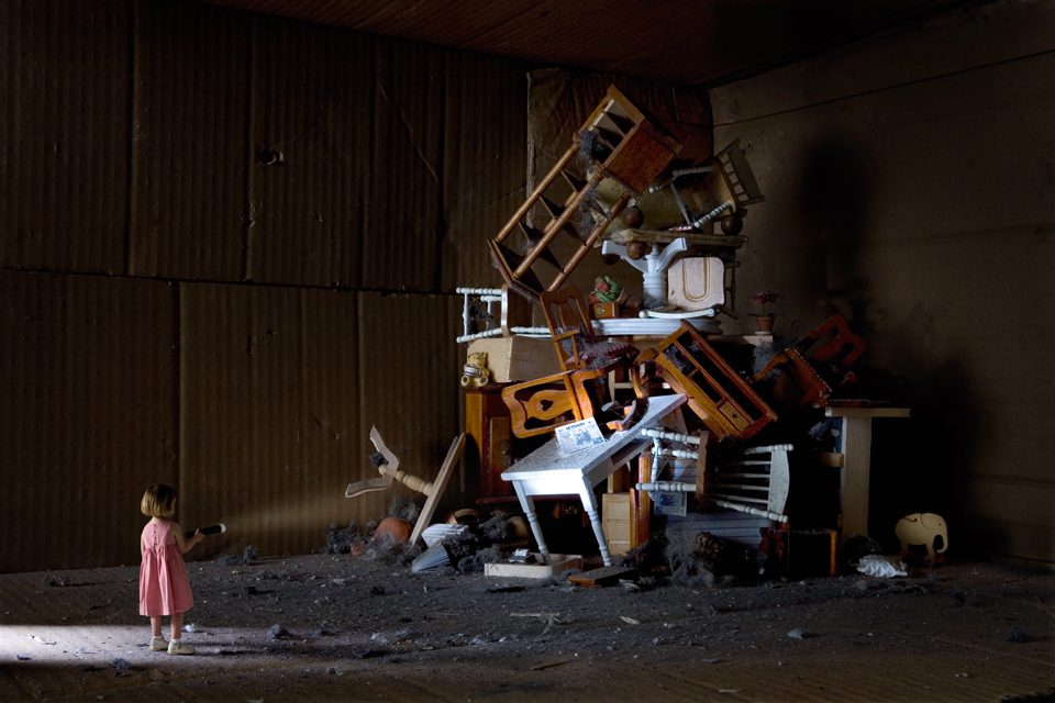 Belgium-based artists Maxime Delvaux (b. 1984) and Kevin Laloux (b. 1982) partnered to form 354 Photographers: an image-making collective working in architecture and advertising. In 2009, with the assistance of Nicolas Velter, the pair set about a project that showcased their ability to manipulate setting, lighting, fashion and narrative. The resulting series was Box, a compilation of dramatic scenarios constructed entirely from cardboard and miniature furniture. Discovering a set of characters mid-disaster, the photographs are ambiguous in their meaning, leaving the interpretation up to the viewer. Each scene was built over the course of two to three days in front of the camera to ensure the perspective was accurate, and the human figures were edited in with Photoshop afterwards. The photographs were a huge success and the duo was even commissioned by the Belgian postal service to create its Christmas cards. The following images are from the Box series and demonstrate the photographers’ impeccable attention to detail.