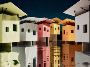For almost 40 years, James Casebere (b. 1953) has devised illusory table-top models, creating thought-provoking and visually deceptive photographs. Made of everyday materials pared down to essential forms, the structures are carefully lit and photographed in the artist’s studio. Illuminated windows suggest signs of domestic life. Water appears to ripple, bathed in a pale glow. Each scene invites the viewer beneath the surface, offering a doorway into imagined worlds.