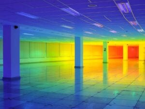 This use of luminous colour provides a psychological and scientific quality to West’s work. Her renowned piece, An Additive Mix (2015), was shortlisted for the Best Light Art Installation in the Darc Awards, London, and exhibited at the National Media Museum in Bradford. When viewed from a distance, the mirrored room spills with bright white light. As the viewer approaches and explores the detail, 250 individual colour tones and shades are revealed. As the light seemingly flows into the distance, the colours begin to distort and merge.