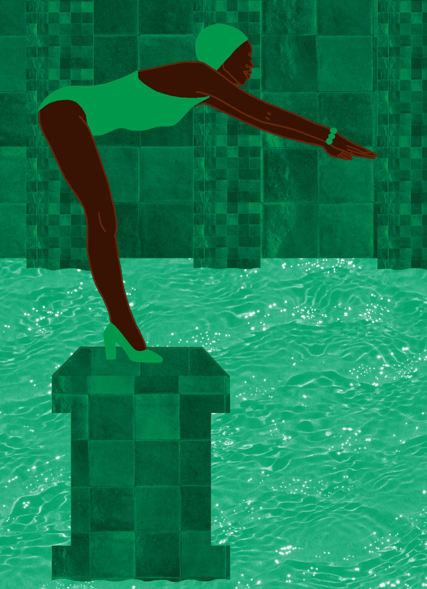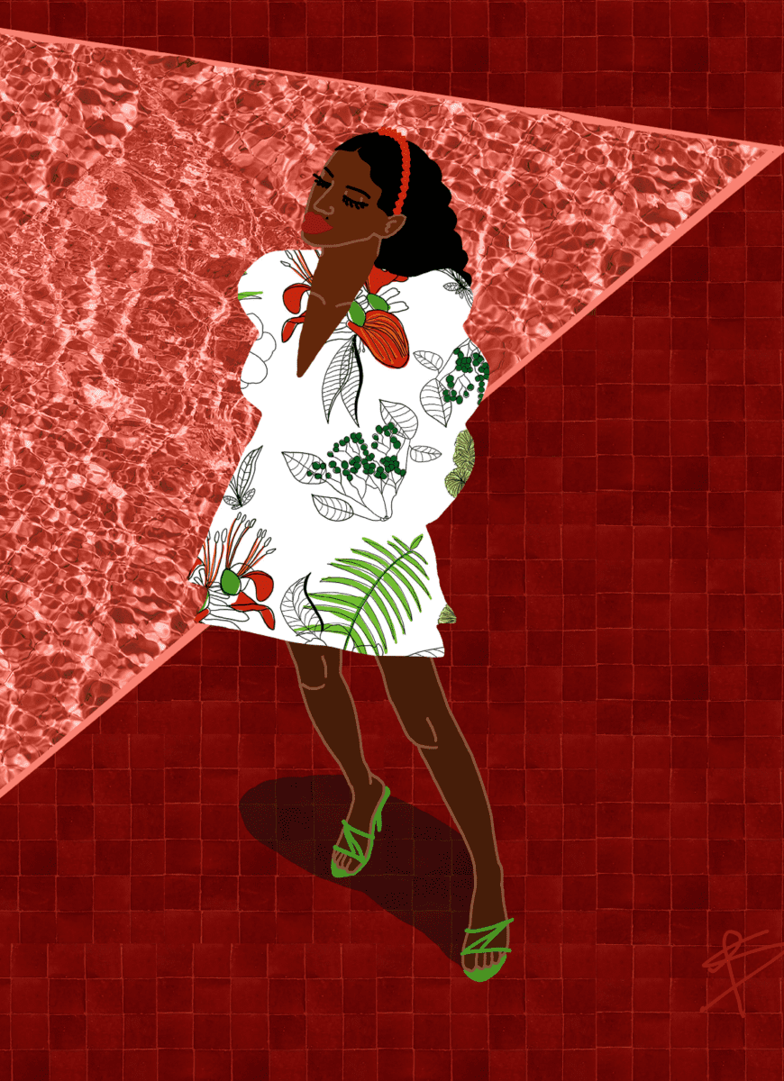 What’s perhaps most powerful is how Seronga uses the visual language of maximalism to represent women of colour. Afro Maximalism opens with a chapter on green, which Seronga cites as being associated with “balance and harmony.” Inside, readers encounter works such as Mint Green Sea, a contemporary take on Norman Parkinson and Grace Coddington’s sartorial photography. The original image, shot for British Vogue in 1975, features Jerry Hall, a white model, poised to jump headfirst into Lake Sevan in Armenia. In Seronga’s interpretation, Hall is replaced with a Black subject, also ready to dive, surrounded by layered shades of green. The artist’s use of collage is masterful, with the flatness of the tiles contrasting with radiant light glinting across the water – redressing the balance in terms of both composition and history.