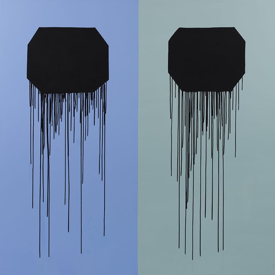 Umerle paints in series that are open-ended, exploring similarity, repetition and difference within each group of work. Split Infinity is geometric and hard-edged, but also contains free flowing areas where rivulets of paint cascade down the surface of the painting. The canvas is a divided field of blue and green.