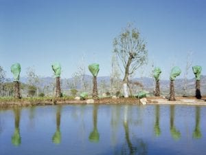 Preston recently won first prize in the landscape category of the 2019 Sony World Photography Awards for a small strand taken from Forest, called To the South of the Colourful Clouds. In these pictures, set in the Haidong Development Zone in Dali, Yunnan Province, a rural area is being transformed into an “ecology model town.” Age-old trees are brought in, planted in red soil, a semi-artificial mixture layered over the ground. In a disused quarry, huge swathes of bright green netting are patched over the unsightly bare rock. The developer’s outlook seems to be that as long as the place is visibly green, the area is deemed environmentally friendly.