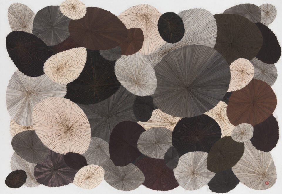 On the second floor, the walls have been stripped bare in an explosive, almost non-consequential fashion. It is a sight that is seemingly in direct contrast to the forethought and precision that Kim has crafted throughout her career. On one wall is The Street (2015): it consists of varying ellipses, in deep greys, rich burgundies and warm creams, each with delicate fan marks scorched onto their suface. The ellipses are all collaged, overlapping one another, as if vying for greater space on the picture’s surface. This is a perfect example of the existential range of Kim’s visual vocabulary. The solemn piece summons the dull echoes from the street, and transforms each ellipse as if they were one of the people below, weaving in and out of the lives of others, unknowingly entering and exiting their lives for a brief moment.
