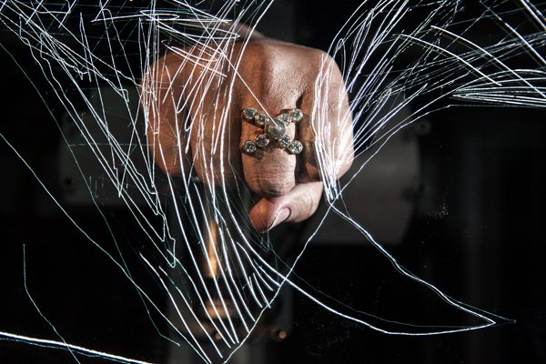 Illuminated by LEDs, the engravings demonstrate a unique mode of collaborating. The participating artist begins by sketching on an iPad; these marks are then interpreted in real time by the Last Train app and sent digitally to a disembodied mechanical fist created by Ron Arad. This fist bears a Diacore diamond ring and responds to the iPad sketches by scratching the design onto a pane of glass.